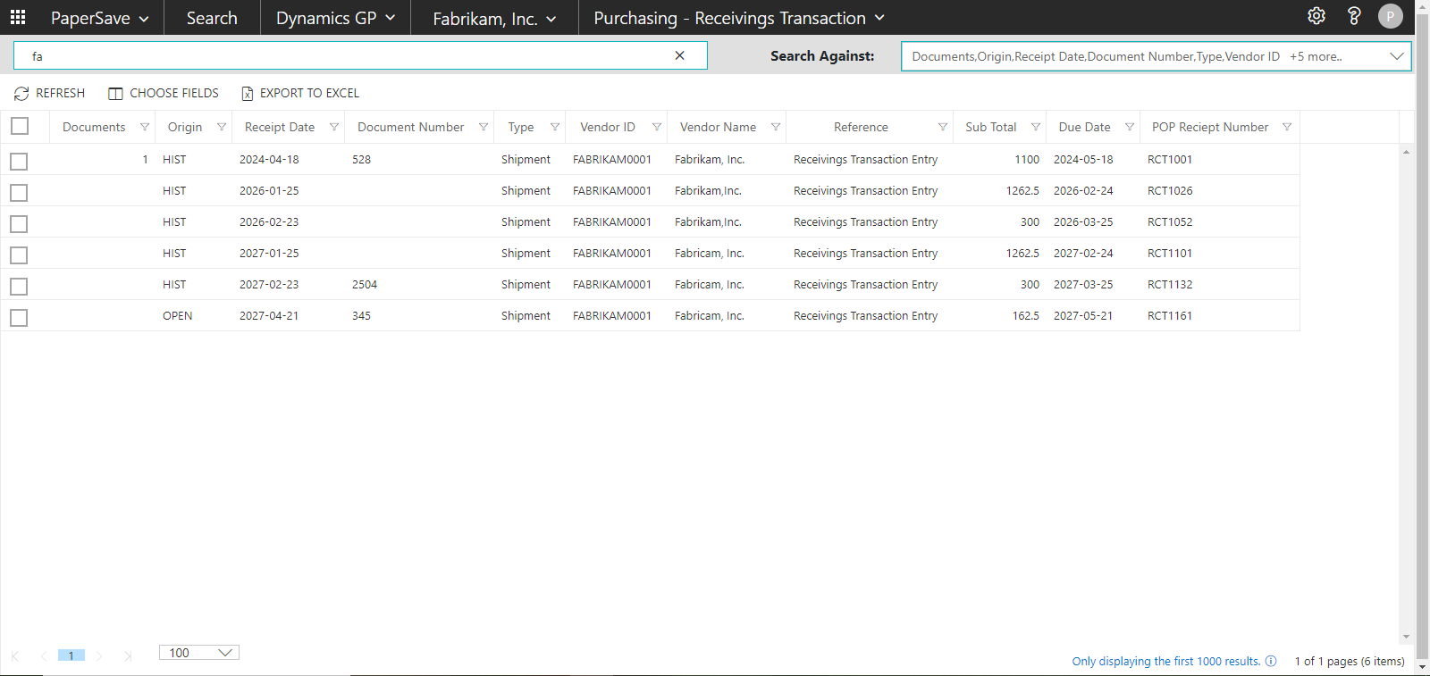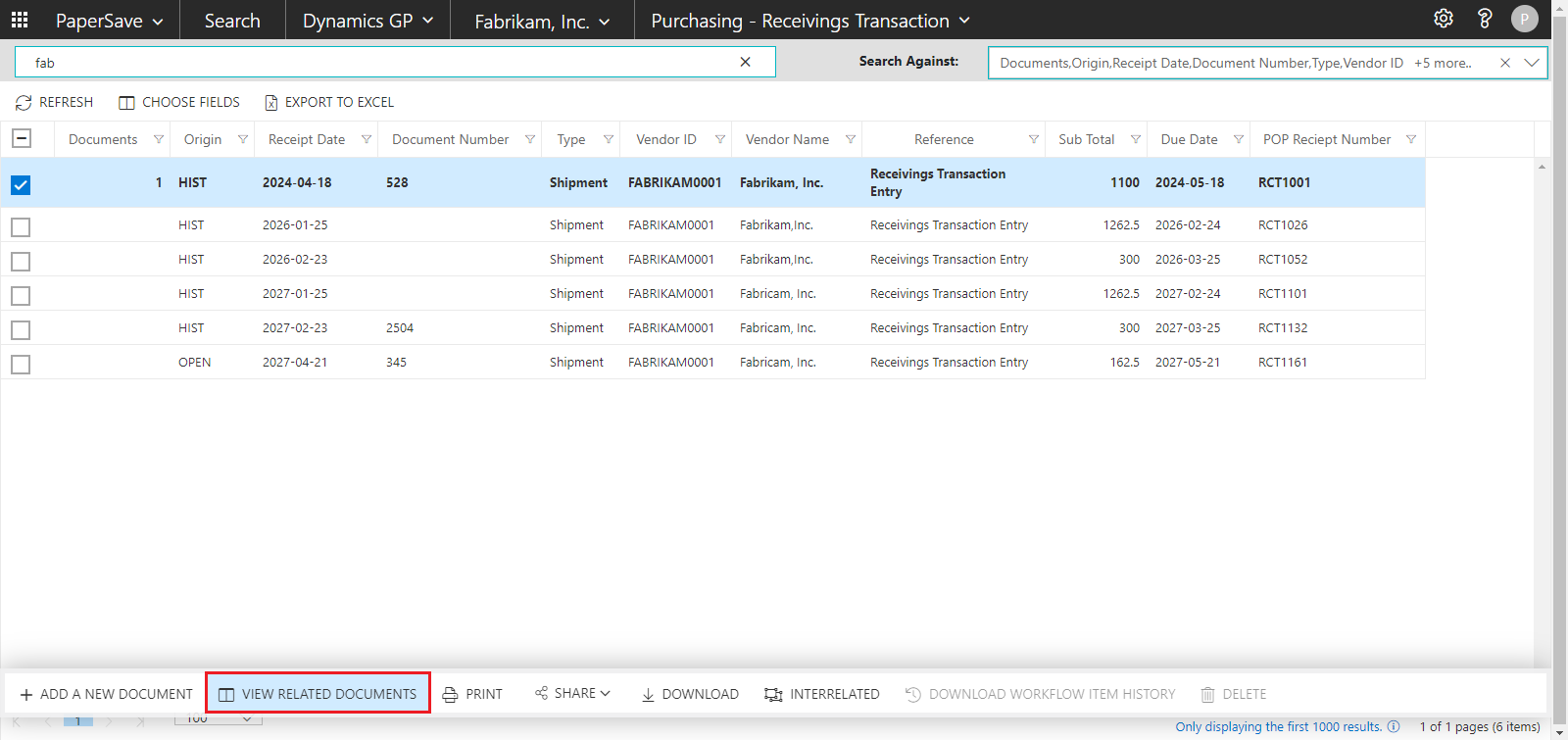 You can view the documents that are associated to any particular record in an integrated application that PaperSave is integrated into. Follow the below steps to view the related documents to an Dynamics GP record: