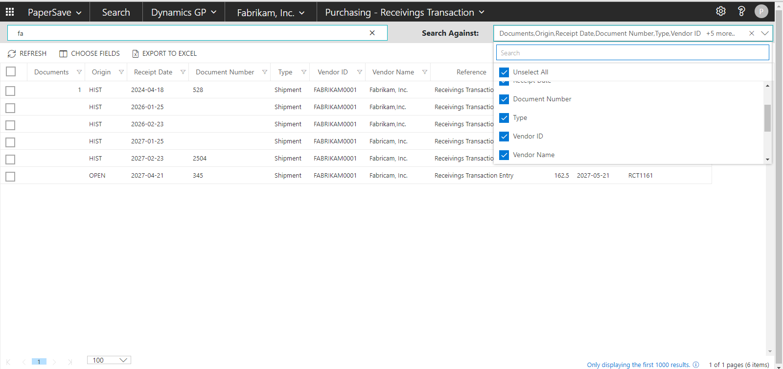 3) You will see a list of supported Record types for Dynamics GP in the Application bar drop-down (tile view if you are accessing for the first time). Select the desired Record Type (For e.g. Purchasing - Receivings Transaction).