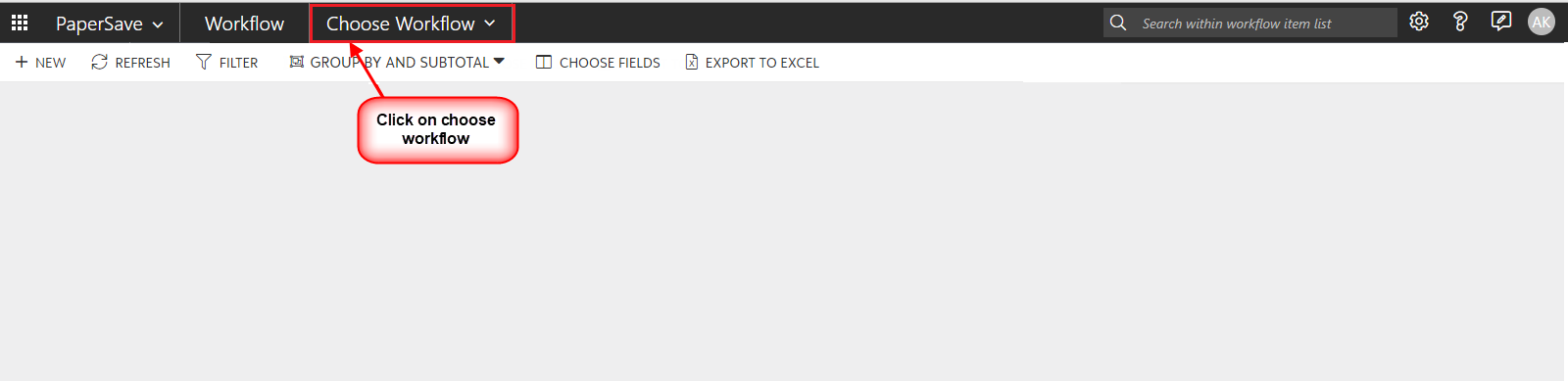 1) Click on the “Choose Workflow” drop-down in the application bar as shown below.