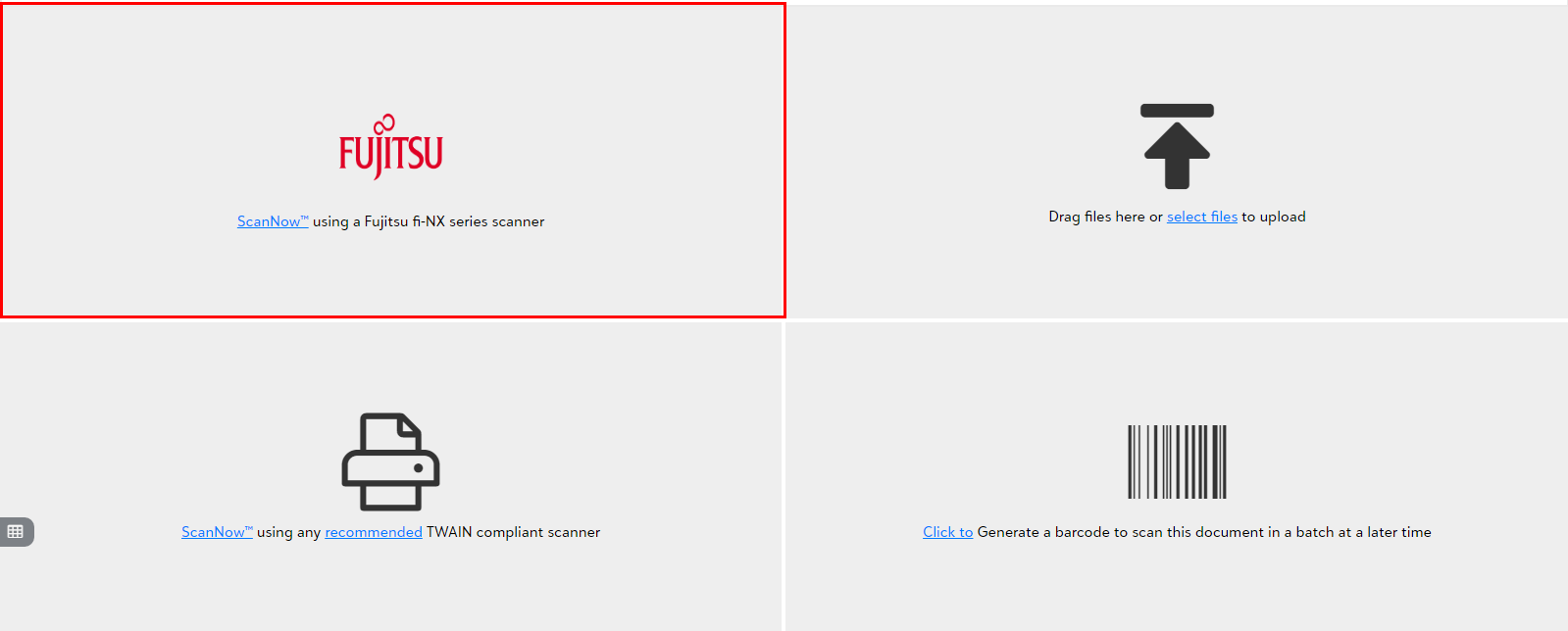 • Click on the "Scan NowTM using Fujitsu fi-NX series scanner" in the file capture options panel to add documents from a Fujitsu fi-NX series scanner as shown below: