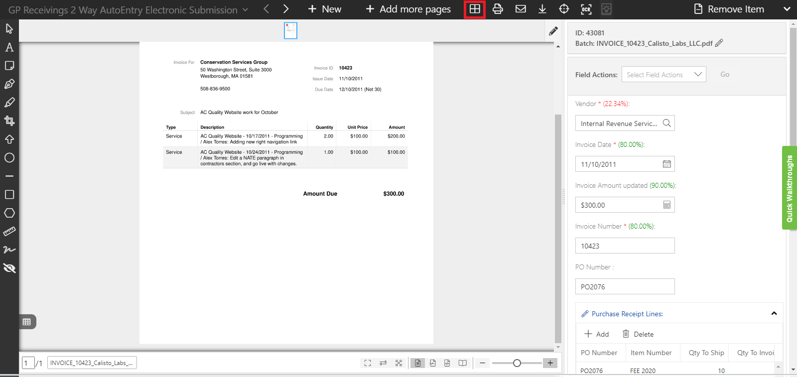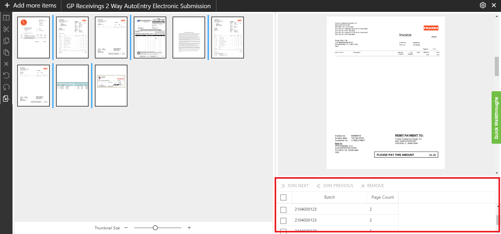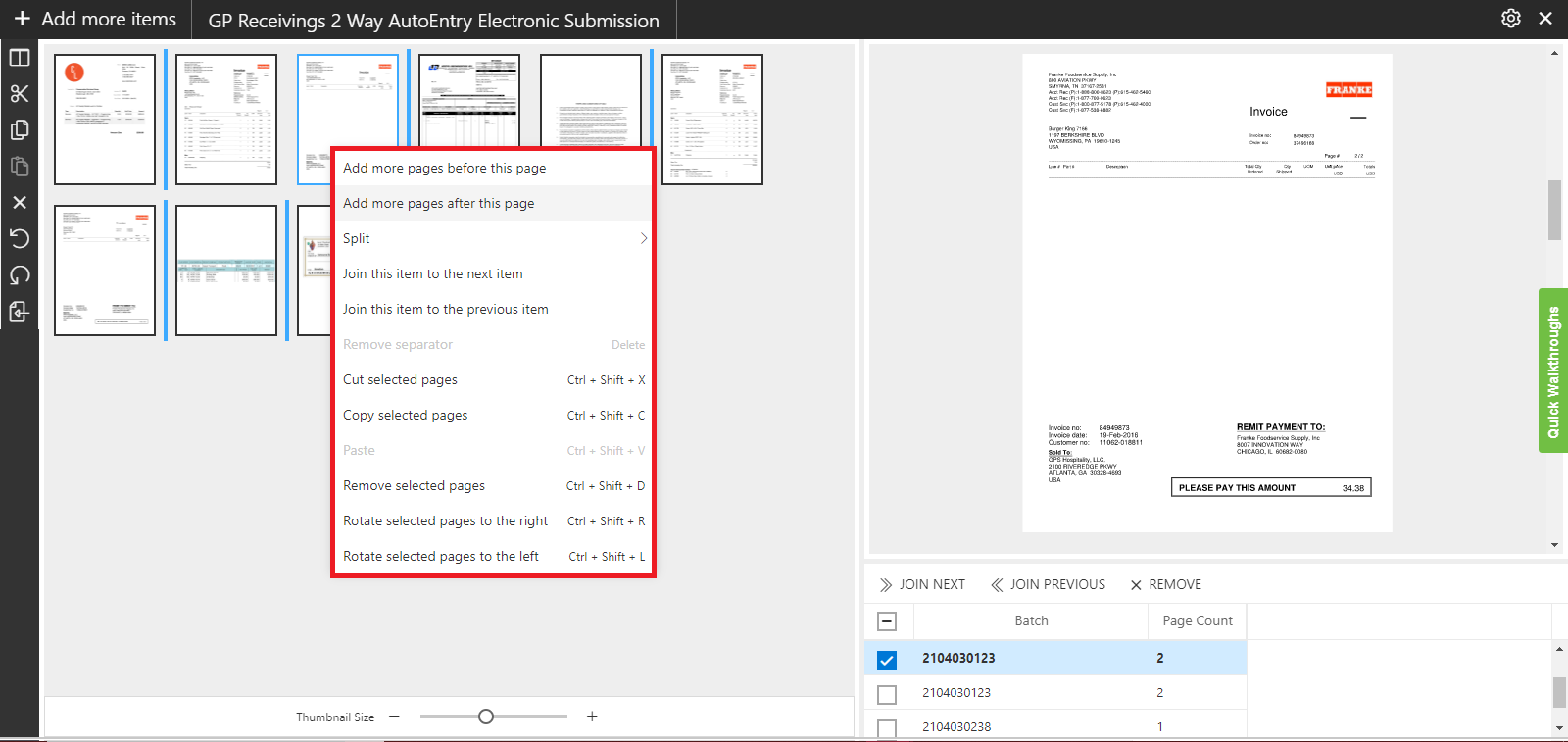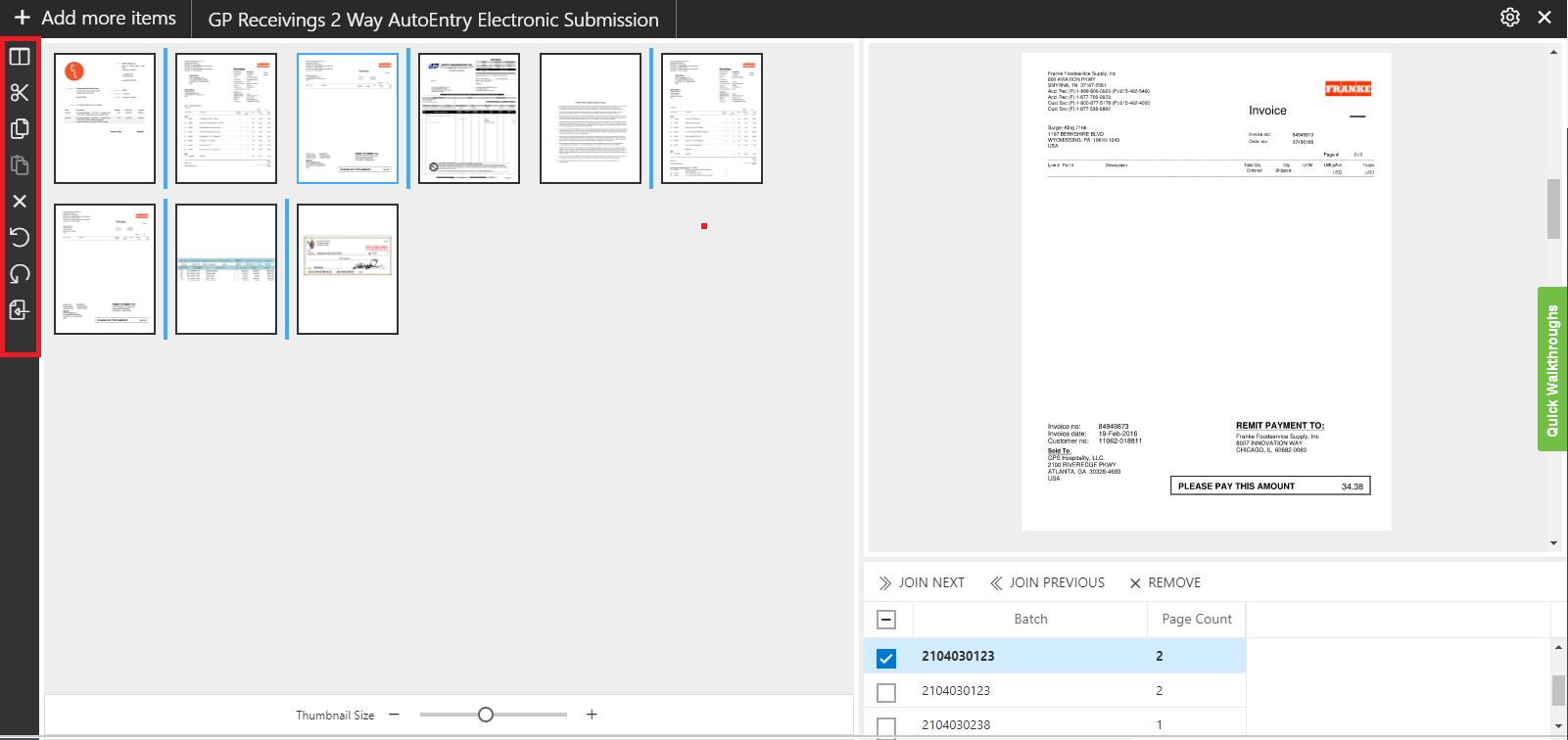 This area offers a thumbnail view for all the unsubmitted items in the Page manipulation view. You can perform various operations on the thumbnails like split pages, cut or copy selected pages, paste those pages, remove unnecessary pages and rotate selected pages.