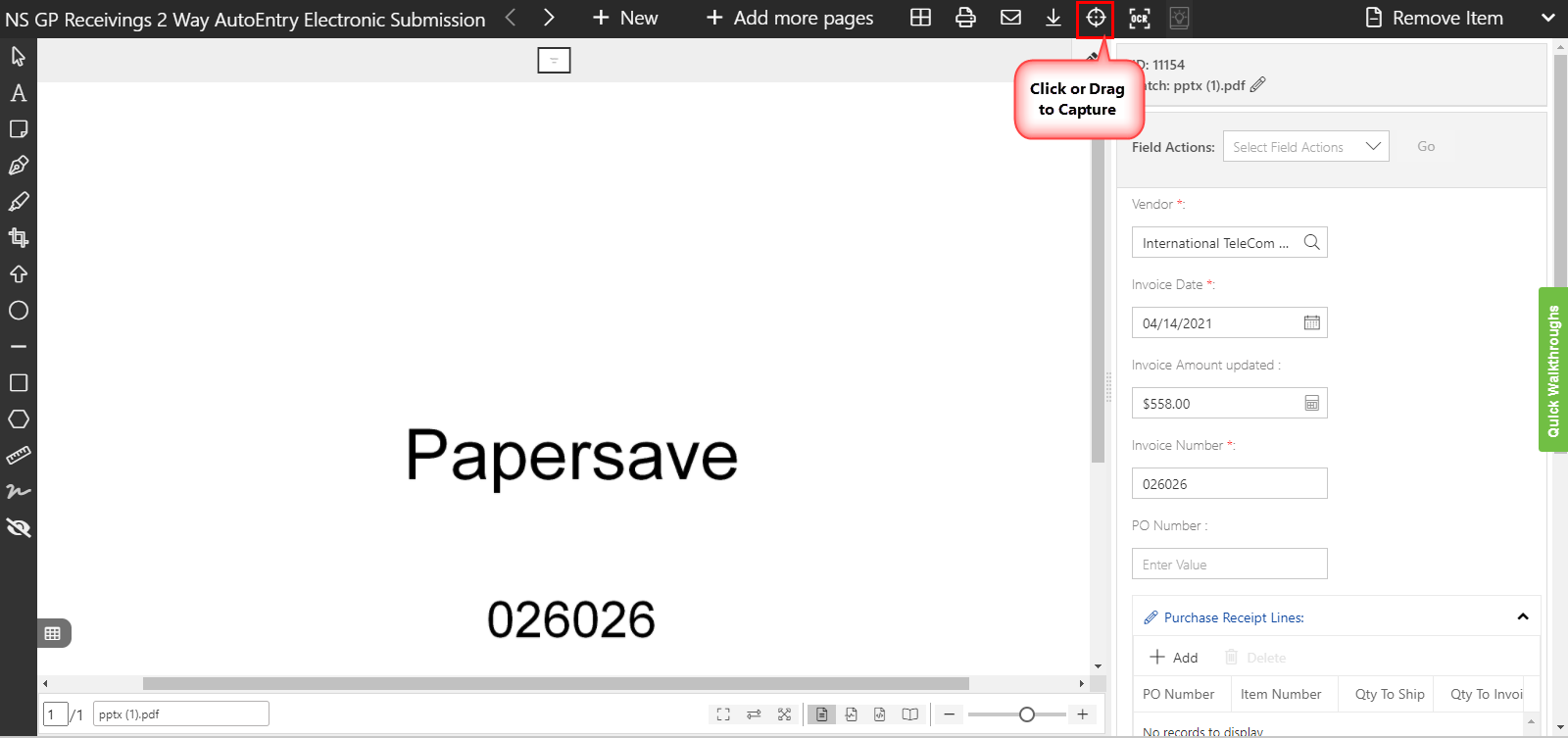 The Drag to Capture tool on the image page options toolbar of the item viewer content panel allows you to hover over a word, grab onto it, and drag it over a field and let go to drop that word into the field. You can also rubber band (which draws a highlighted area around the selected text) multiple words, grab onto them, and drag them over a field to drop all those words into the field. This is a very useful tool to validate and correct values that were not captured correctly by OCR or to help make manual entry more efficient.