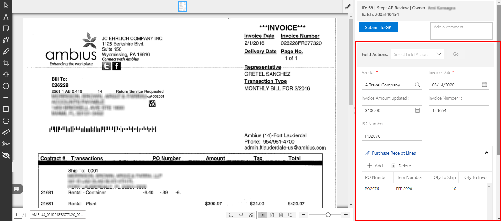 Similarly, based on the Workflow fields properties, some fields such as vendor, PO Number etc can be looked up against the Dynamics GP's database using different properties. For amount related fields such as Invoice amount, You can optionally use the calculator widget to perform desired calculations and determine the amount. The value of this field is defaulted to the amount captured by OCR in case if the document went through OCR processing successfully.