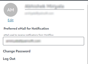 Click on the option from the top right corner in the Application toolbar to edit the current user details such as profile picture and preferred Email for Notification, Change Password, Log Out and Change Theme, as shown in below screen.