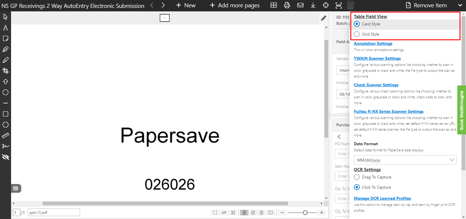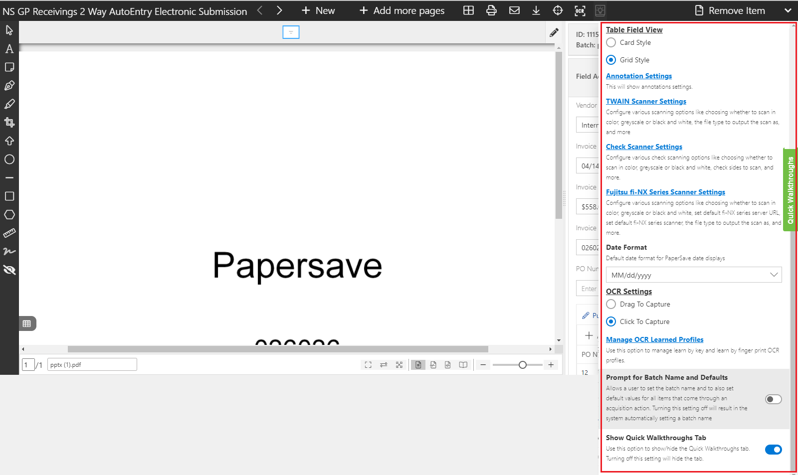This Setting option enables you to configure OCR related preferences in the Workflow item viewer as follows. Set the preference to use drag or click action for correcting the Profile fields upon OCR processing.
