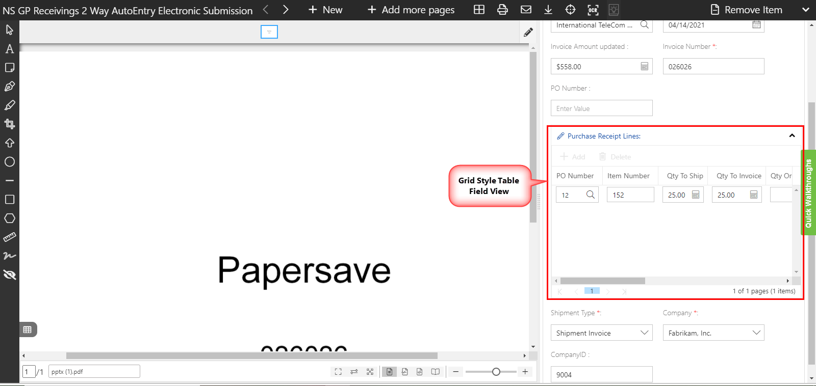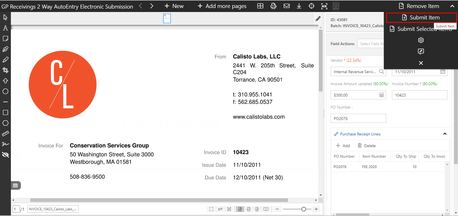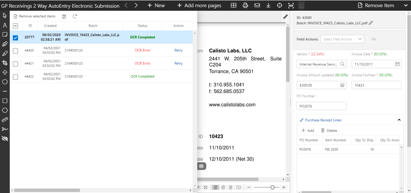 The area presents the field panel in right corner of the item viewer with various fields related to document type or Workflows. The field data is either automatically captured via Optical Character Recognition (OCR) technology, looked up against values in Dynamics GP's database (using SQL) or entered in manually. Fields that are captured via OCR will show a percentage value in parentheses next to the field label. This percentage represents the confidence that the OCR engine has in the value it captured. The more exact the match , the higher the confidence score.