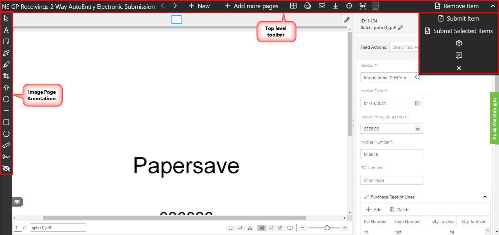 Unsubmitted Workflow items can be worked on from item list and opened in the item viewer once they are acquired successfully. Various operations can be performed on Workflow items while working with them in the item viewer such as editing fields, adding annotations, submit one or more unsubmitted items etc.