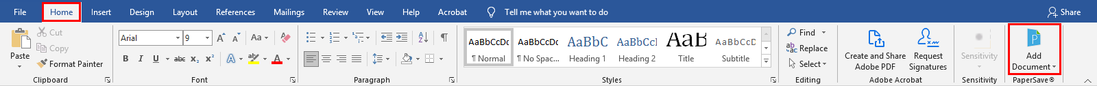 2) Within the home tab, you will see the PaperSave's Add Document Add-In as shown in the below screen.