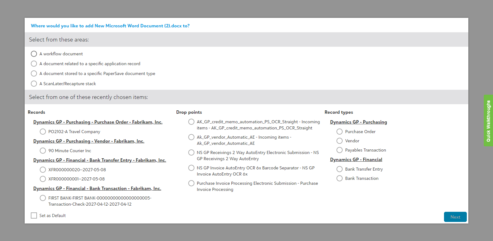 Using this Add-In, you can print any PaperSave supported mime types' document, associate it with a Dynamics GP record, add it as a workflow item or a PaperSave Document type.
