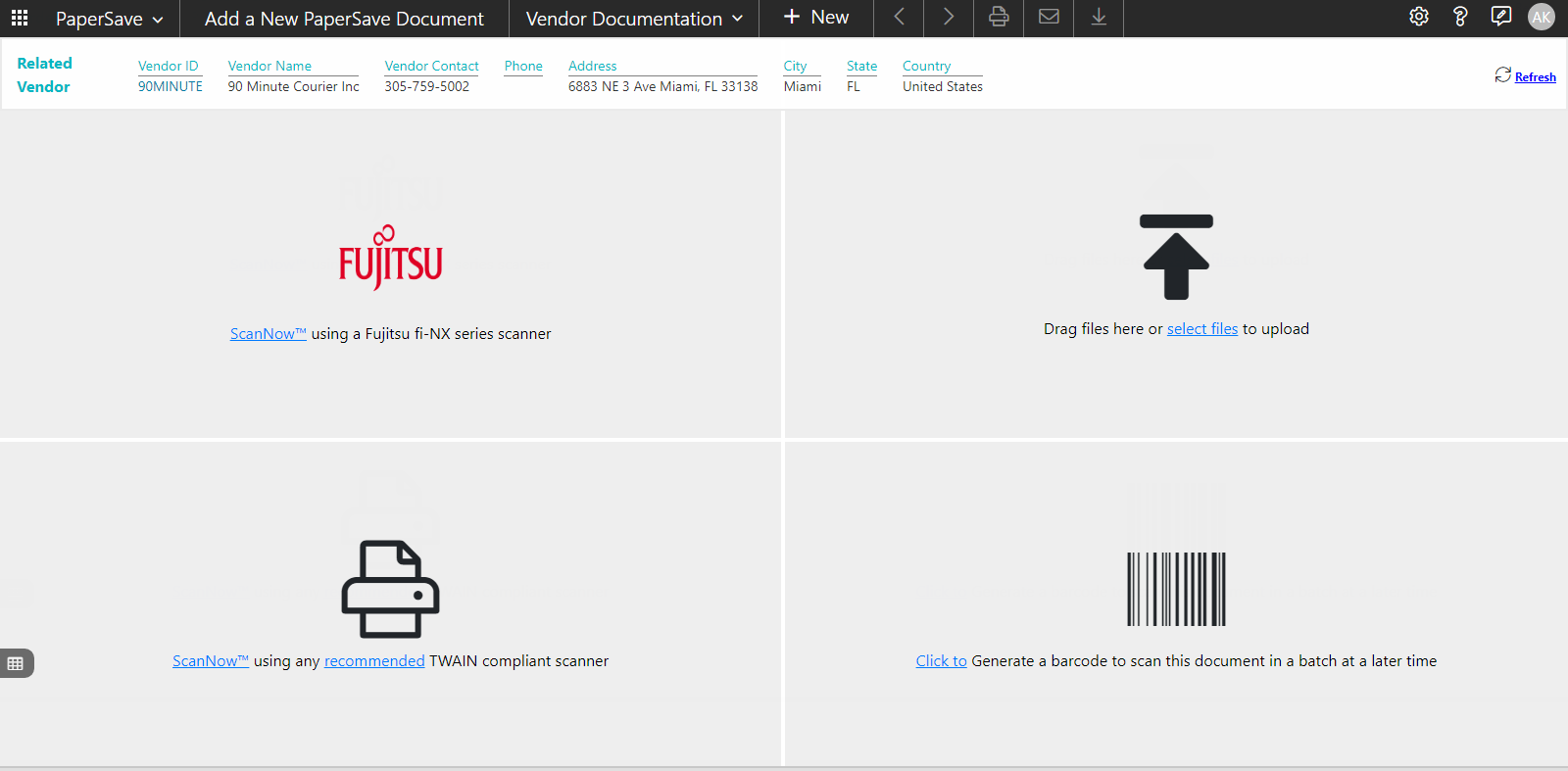 You can add documents to Dynamics GP record using various file capture options such as scanning the documents by using a TWAIN compliant scanner or Fujitsu fi-NX series scanner, uploading files from your file explorer or generate a barcode to scan the documents in a batch at a later time.