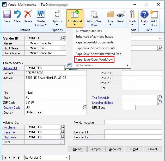 Follow the below steps to navigate to PaperSave Workflow Area from a Dynamics GP record: