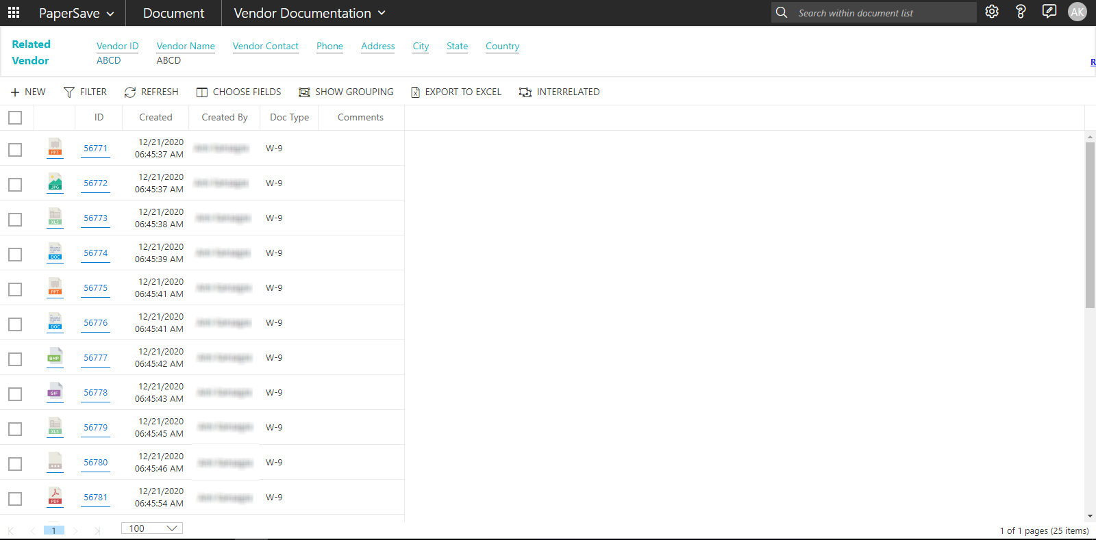 3) Now, you will be redirected to a list of documents associated with the Dynamics GP record (if exists) in the PaperSave Document list windows as shown below, where you can click on the ID hyperlink or double-click on the desired item to open that document in the item viewer.