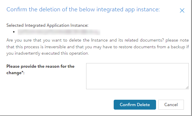 5) On clicking the Delete Integrated App Instance option, a dialog box will pop up. You must provide the appropriate reason to delete the integrated app instance and then, click on Confirm Delete option, as shown in the below screen.