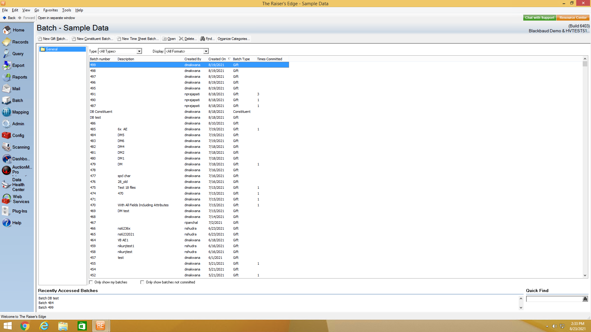2) Once Batch page opens, create new Gift Batch or select the desired Gift Batch type from the existing list of batches or "Recently Accessed Batches" section, as shown below.
