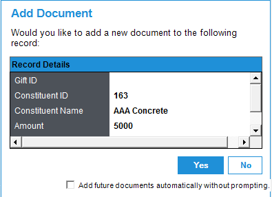 4) Now, when you will move to the next row in the batch, or save the records in the batch, it will prompt the Add Document dialog box as shown below where clicking on Yes will redirect to PaperSave's Add document window, and on No, it will close the dialog box.