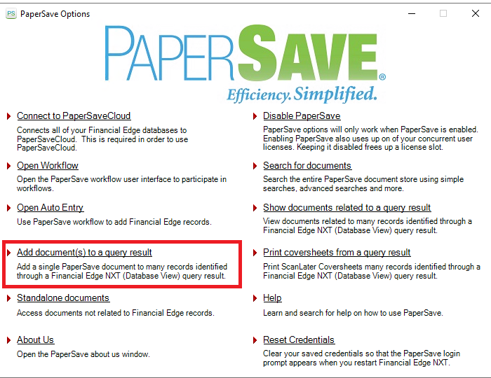 3) Click on the Add document(s) to a query result option from the PaperSave Options Window as shown in the below screen: