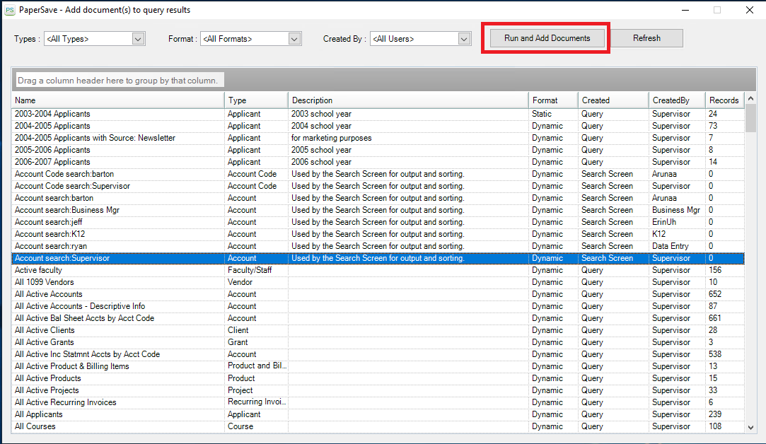 4) Now, select your desired query from the "PaperSave - Add document(s) to query results" dialog box and click on Run and Add Documents button, as shown below.