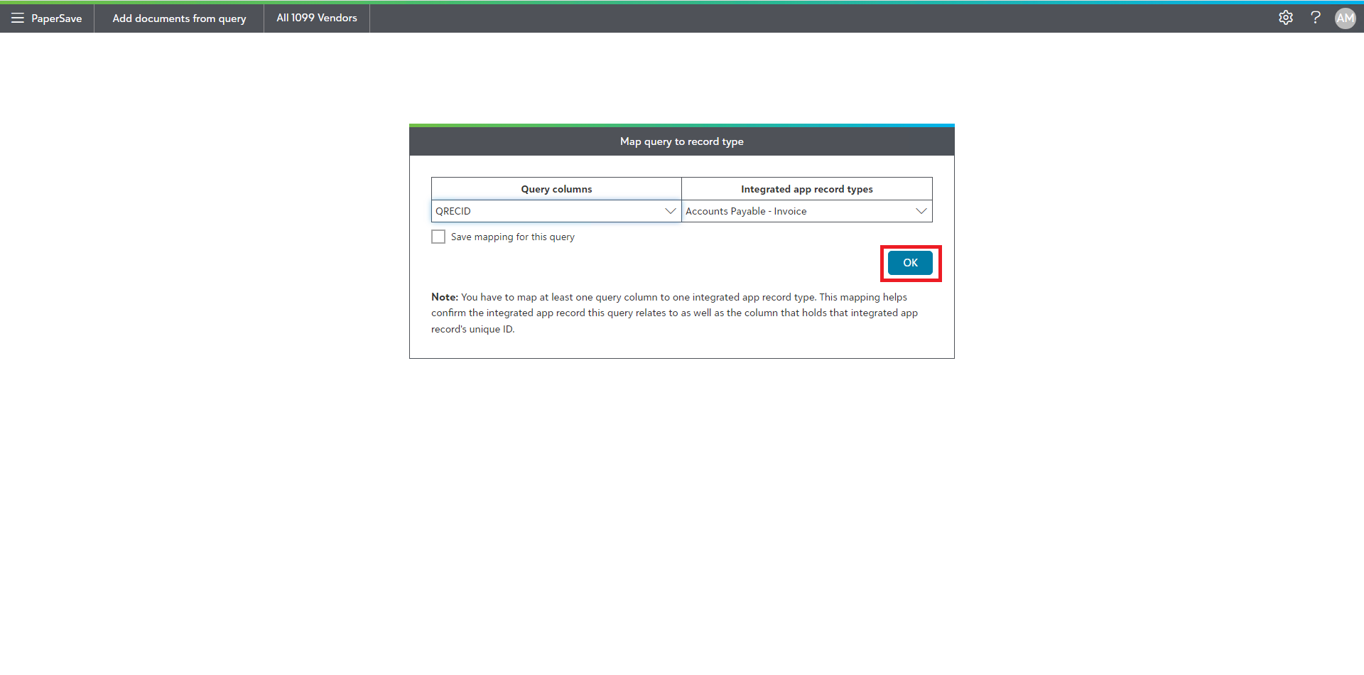 5) You will be redirected to PaperSave's "Add documents from query" window in the browser as shown in the below screen. Here, you need to map 'Query columns' with the PaperSave supported Financial Edge record types in the drop down list and click on OK to map the query. You can check the box to "Save mapping for this query" directly from the dialog box.