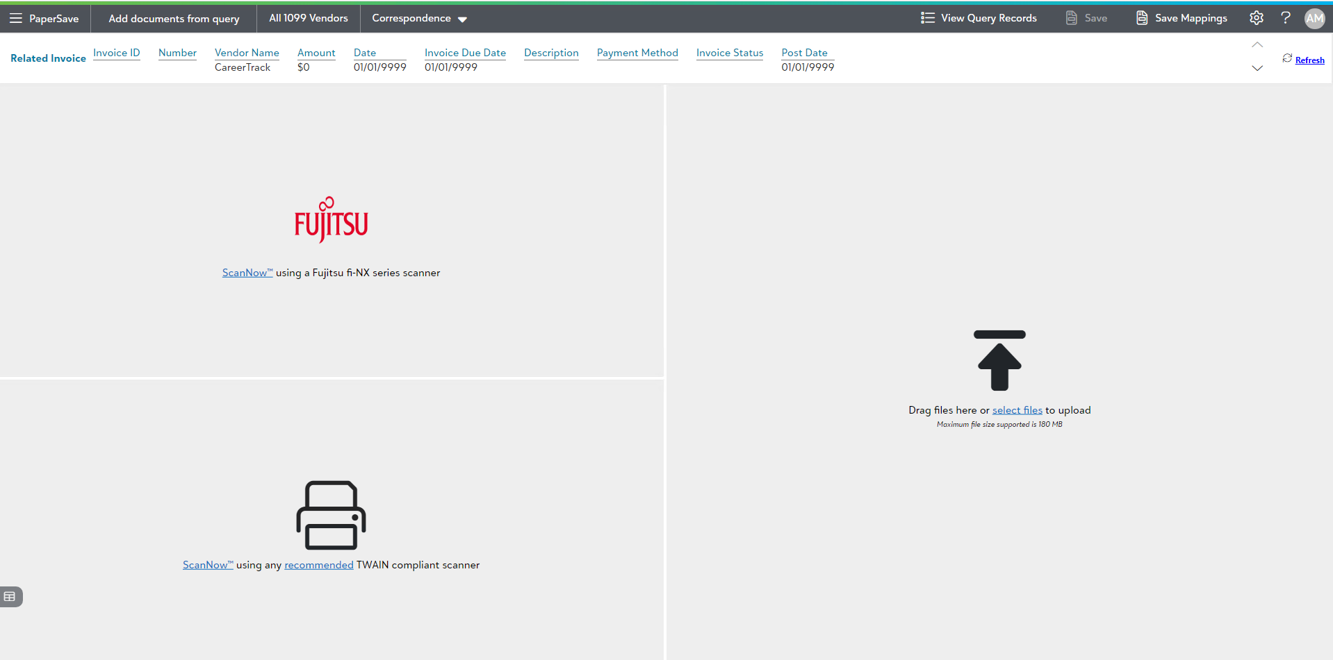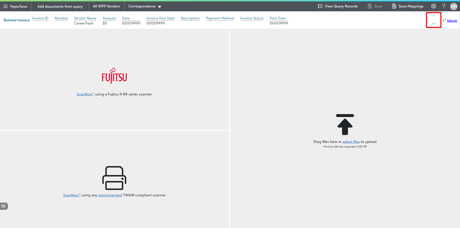 7) From this add document page, you can navigate to different PaperSave Areas, change the document type, view a list of the query records, save/clear mappings, and acquire the document by using different file capture options.