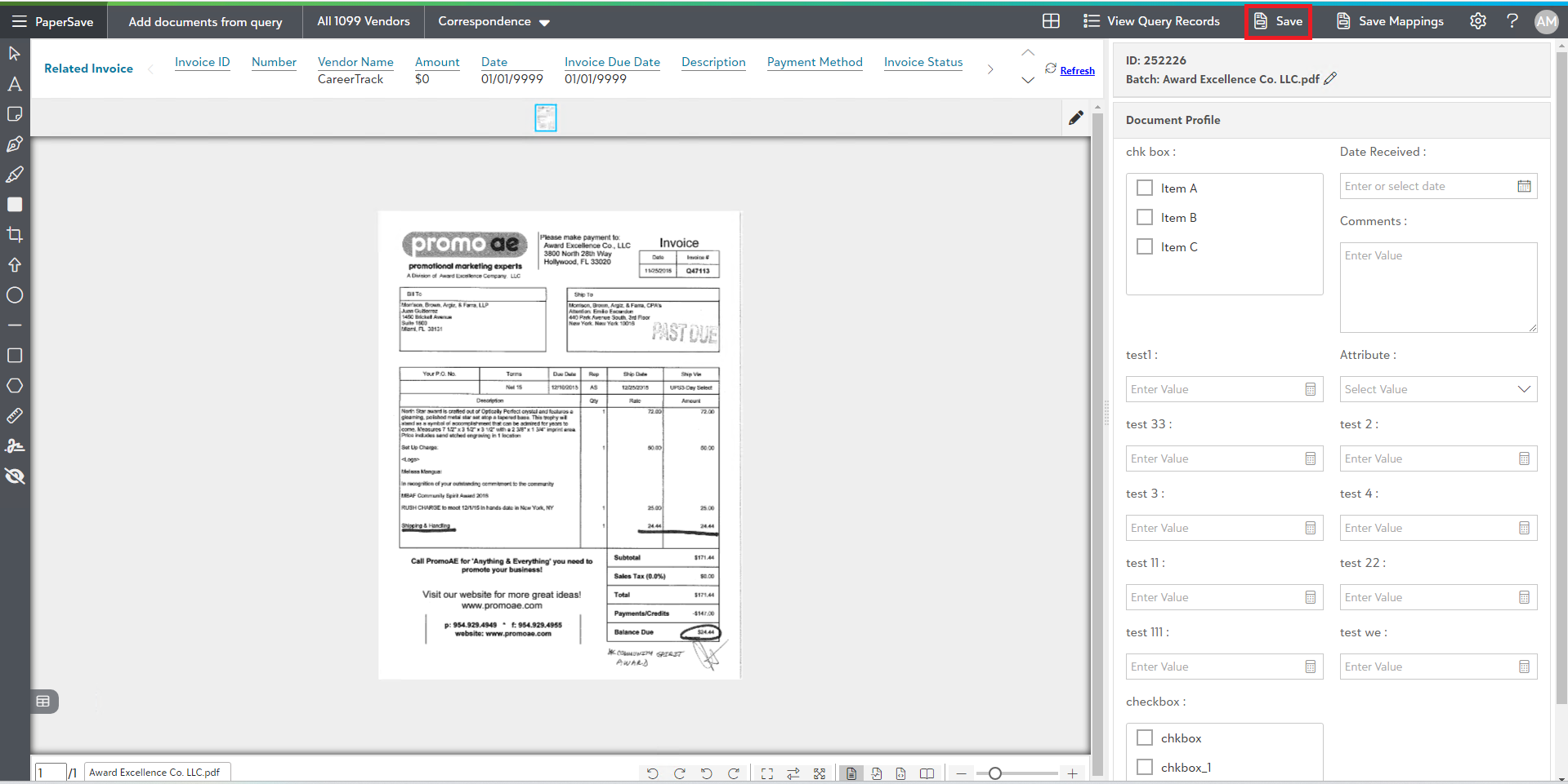 8) Once you have acquired the document, you will be redirected to the item viewer where you can enter the required values in the profile fields and apply annotations as needed before clicking on Save option from the top-level toolbar to add the document to the selected record.