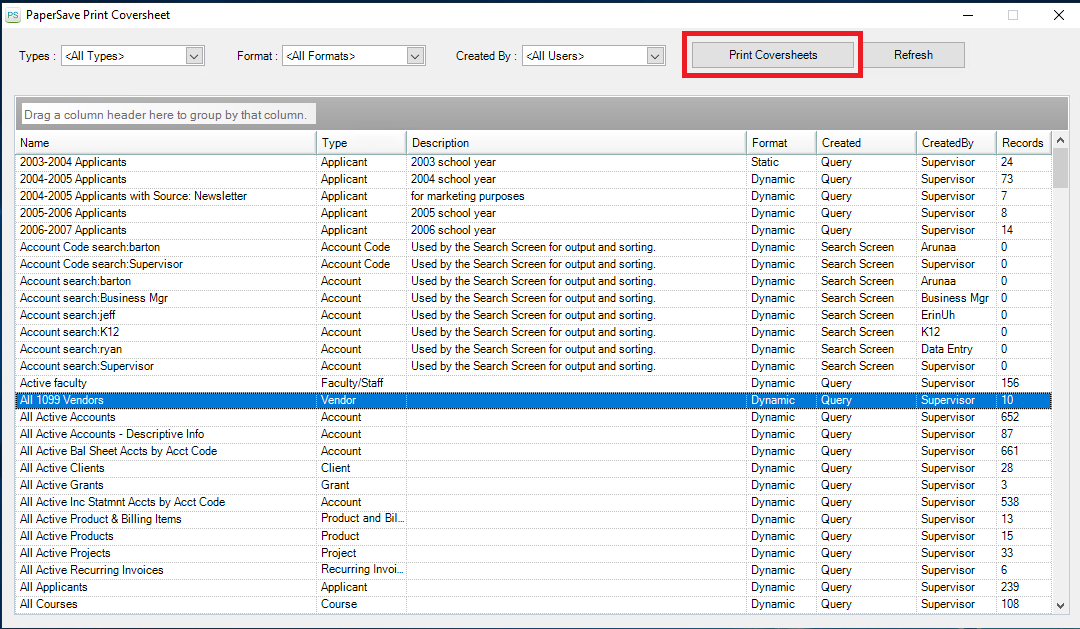 4) Now, select your desired query from the "PaperSave - Add document(s) to query results" dialog box and click on Print Coversheets button, as shown below.