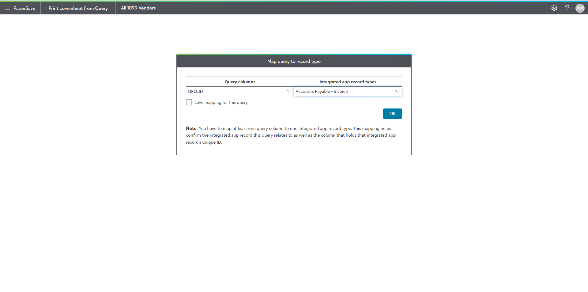 5) You will be redirected to PaperSave's "Print coversheet from Query" window in the browser as shown in the below screen. Here, you need to map 'Query columns' with the PaperSave supported Financial Edge record types in the drop down list and click on OK to map the query. You can check the box to "Save mapping for this query" directly from the dialog box.