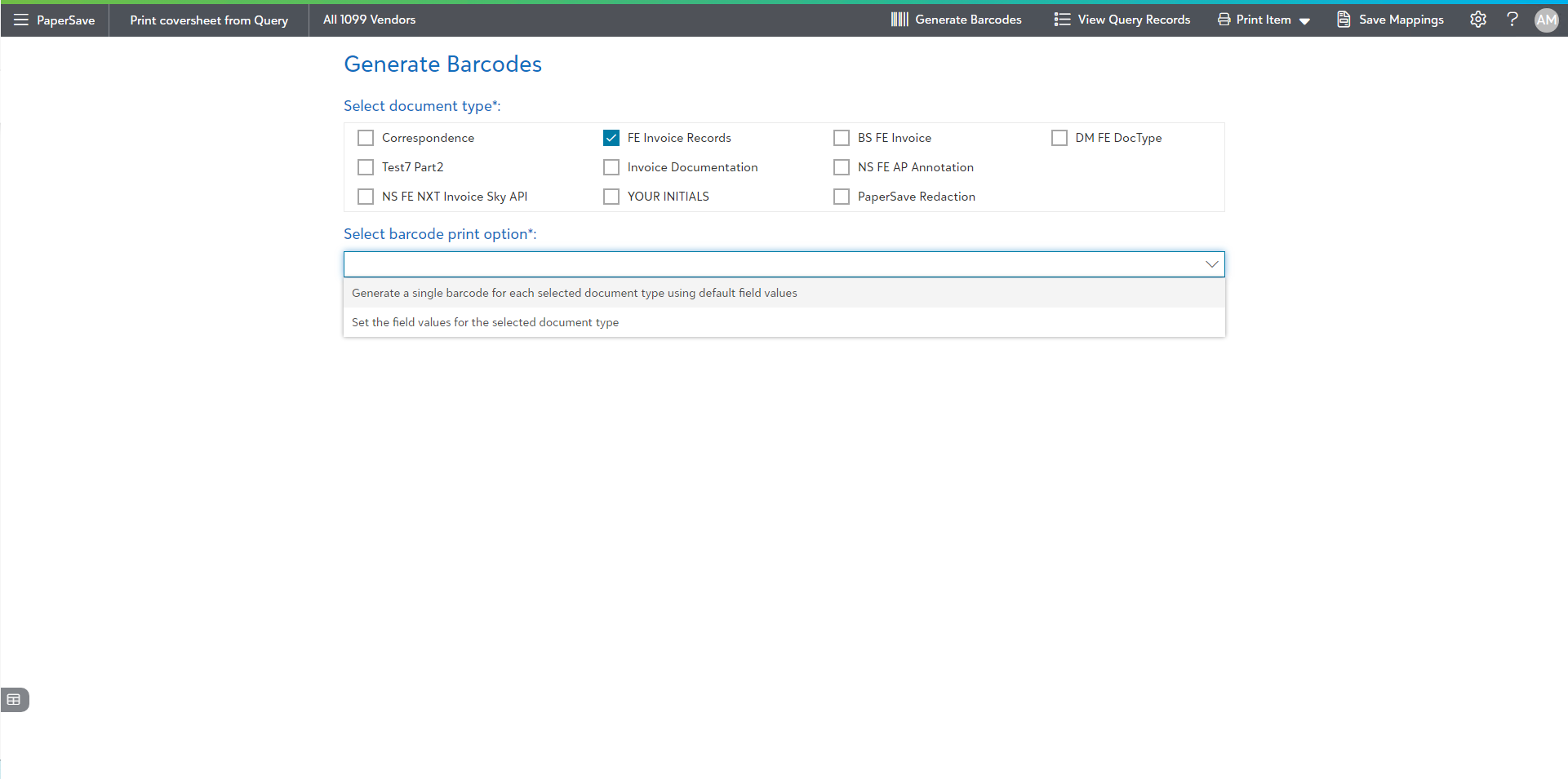 - Generate a single barcode for each selected document type using default field values: This will create a single coversheet for each of the document types selected in the Document Type pane for each record in the Query result. When you will select more than one document type, then only this option will be available in the drop-down list.