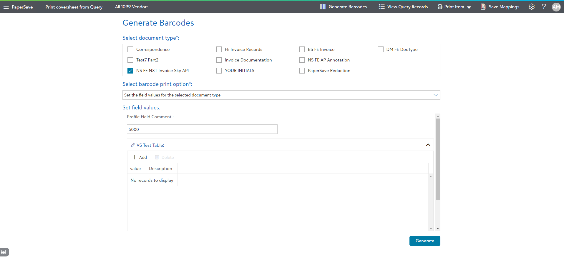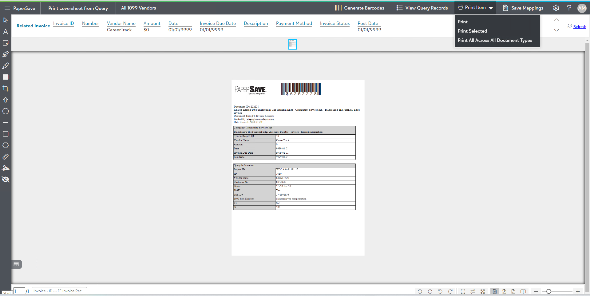 7) Now, a barcode will be generated for all the query records and you will be navigated to an item viewer, as shown below. Here, you can navigate to different PaperSave Areas, Generate another Barcode, view a list of the query records, print the barcodes, and save/clear mappings.
