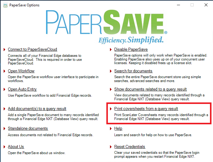 3) Click on the Print coversheets from a query result option from the PaperSave Options Window as shown in the below screen: