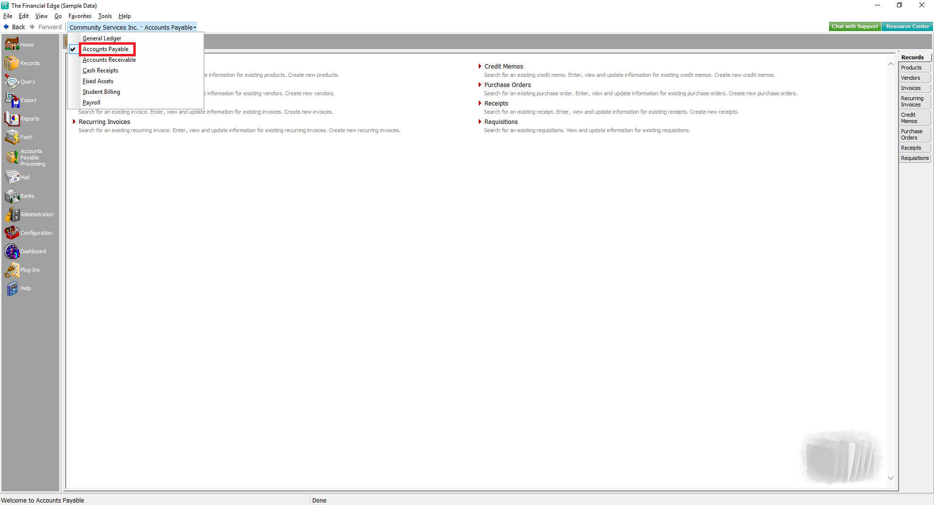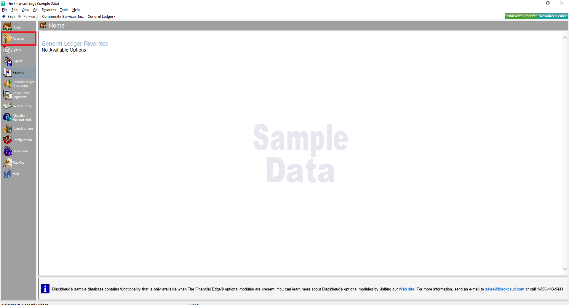 1) Log in to Financial Edge and click on Records in the Financial Edge bar on the left side of the screen, as shown below.