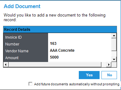 4) Now, if you are adding a new Invoice record, then you must save the record to use PaperSave options. And, once you save the record, it prompts you Add Document dialog box as shown below where clicking on Yes redirects you to PaperSave's Add document window, and on No, it closes the dialog box.