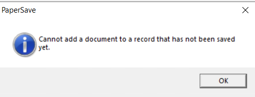 Note: While adding a record, if you try to access any PaperSave options without saving the record, then it will prompt you with an error as shown below.