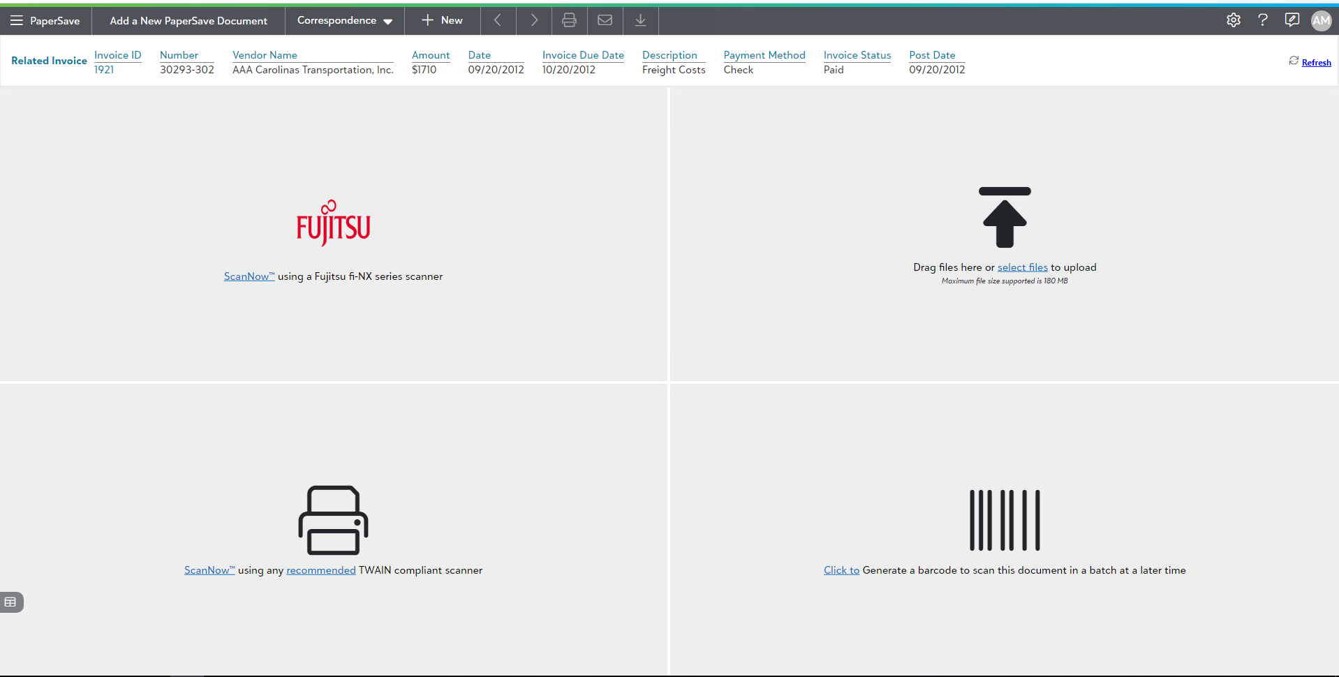 You can add documents to Financial Edge records using various file capture options such as scanning the documents by using a TWAIN compliant scanner or Fujitsu fi-NX series scanner, uploading files from your file explorer or generate a barcode to scan the documents in a batch at a later time.