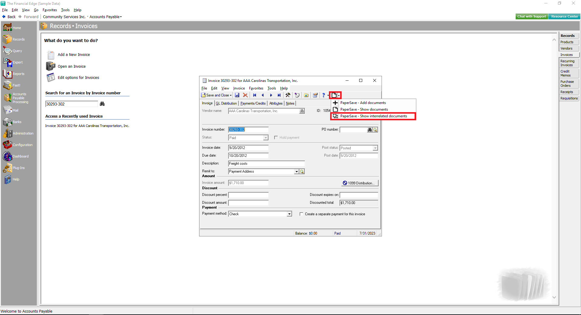 1) In Financial Edge, Click on PaperSave - Show interrelated documents from Record as shown in the below screen.
