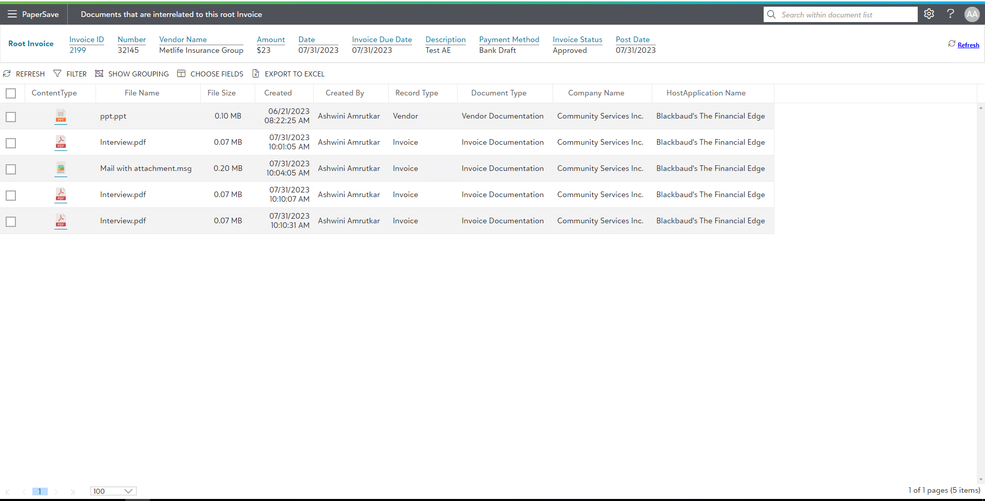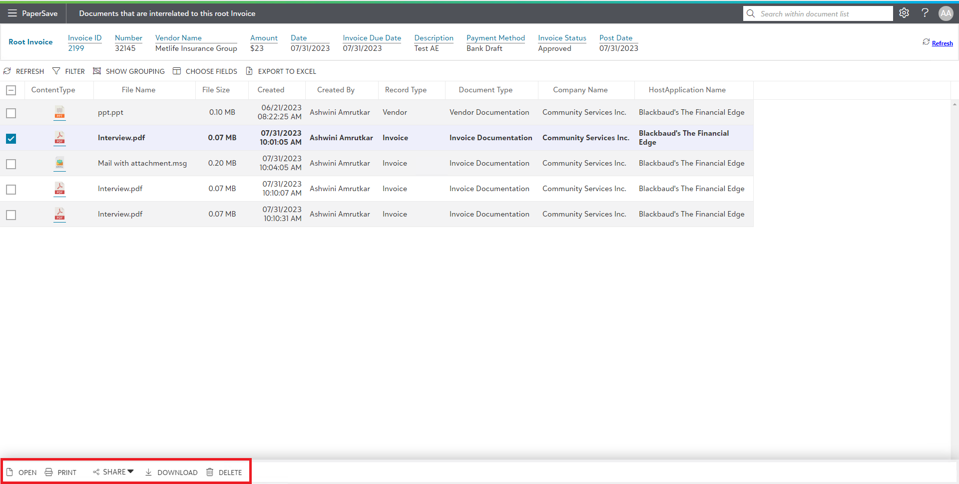 2) Now, it will open interrelated document list window of PaperSave application. If there are multiple documents interrelated with the Financial Edge record, then PaperSave document list as shown in the below screen.