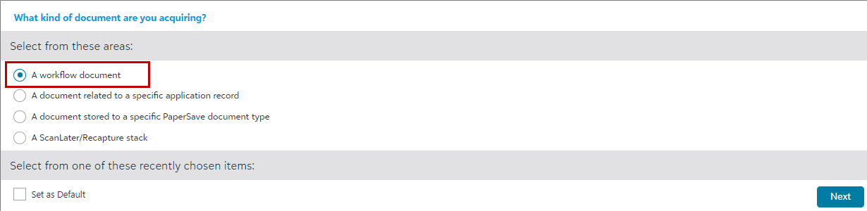1) Select A Workflow document in the type of document you want to acquire menu and click on the Next button in the lower right corner.