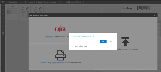3) Once you add a stack of papers using your desired method, you may be prompted to overwrite the batch value set when the barcode coversheet was created, or create a new batch name, as shown in the below screen.