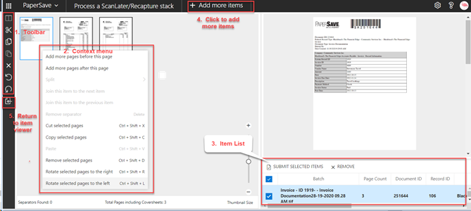 6) Once the items are processed, they will open in “Page Manipulation View”, where you can perform various operations before submitting them, such as: