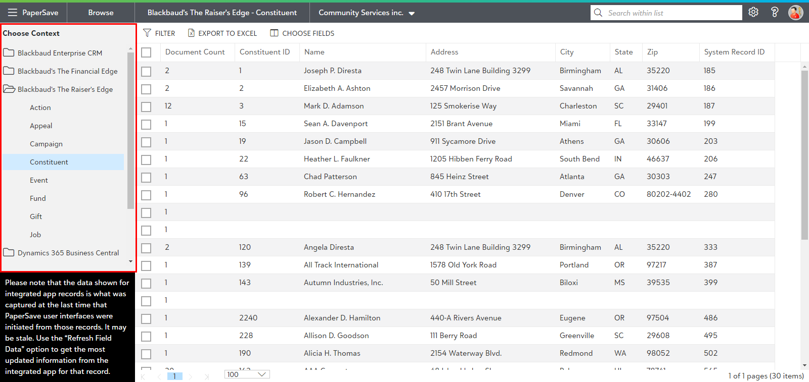 Tip: Document Count column displays the total number of documents attached to that particular record for any chosen context.