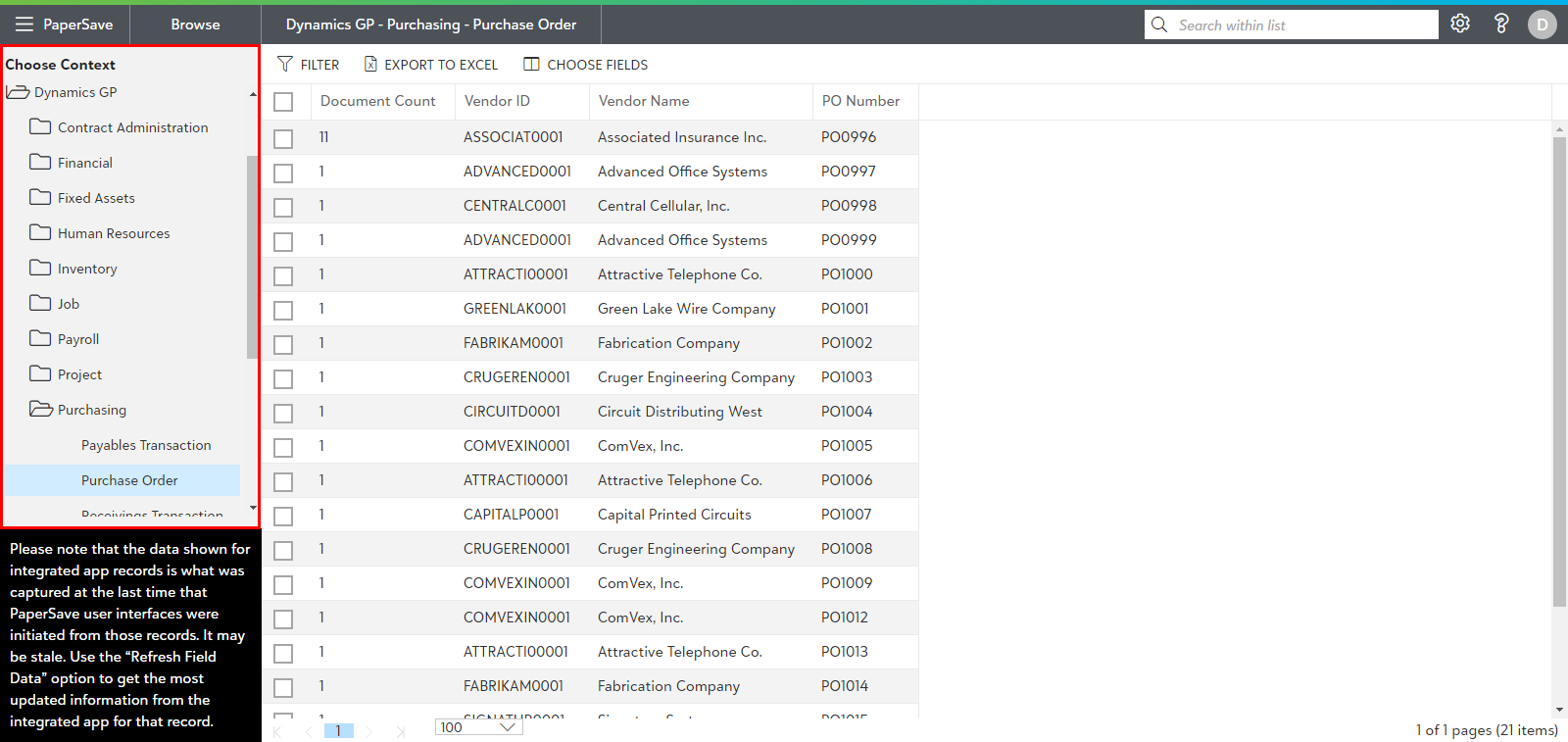 - Choose the context to browse the documents for the desired record type of an integrated application. The currently selected context is displayed in the Application bar in the format of "Integrated App - Module - Record type". For example - Dynamics GP - Purchasing - Purchase Order as shown below.