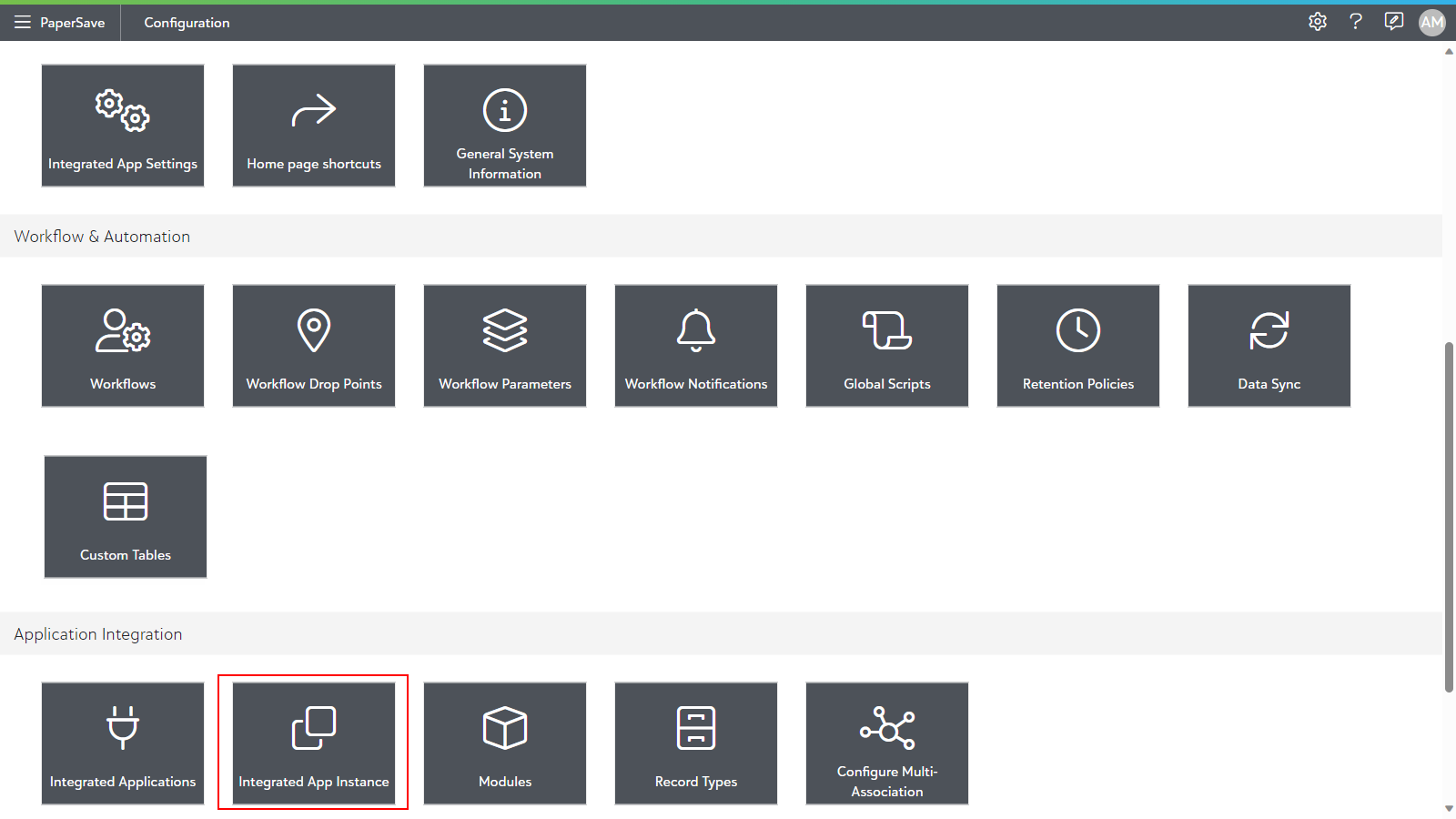 PaperSave allows you to register/deregister and manage one or more integrated app instances related to your integrated application within PaperSave by using different data connections. The Integrated App Instances module can be accessed from the Application Integration section in the Configuration Area.