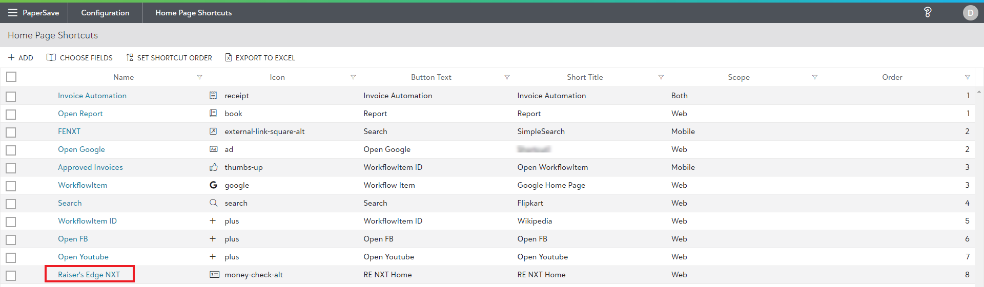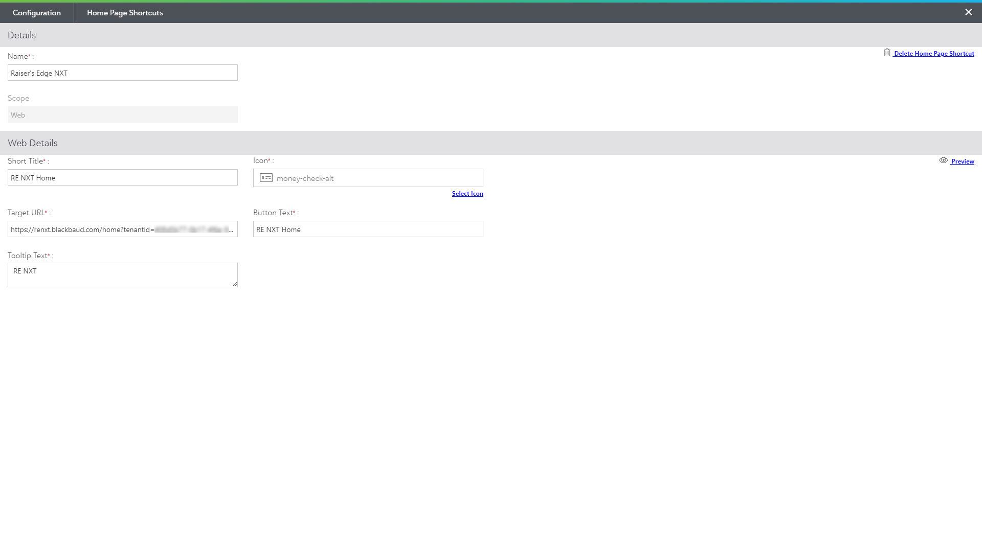 1) Click on the Home page shortcuts tile in the General Settings section of the Configuration Area to open the list of shortcuts.