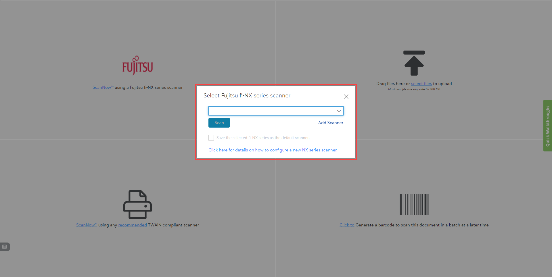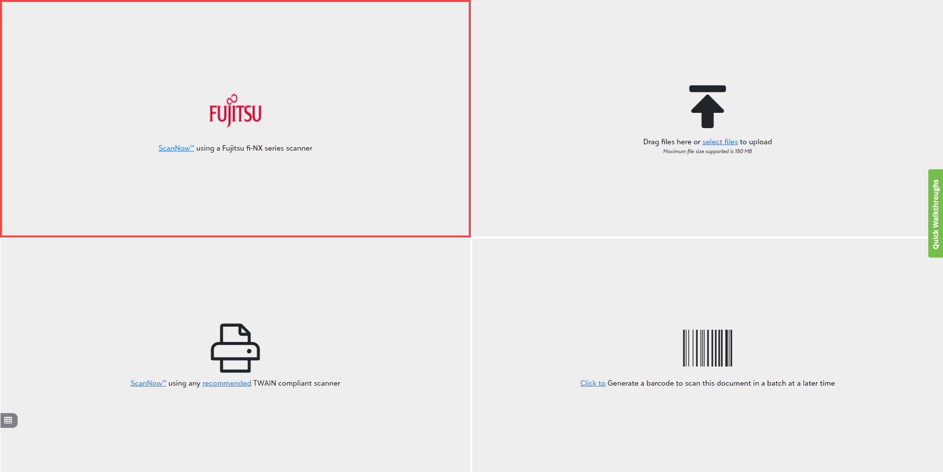 1) Click on the "ScanNow™ using Fujitsu fi-NX series scanner" in the file capture options panel to add a document from a Fujitsu fi-NX series scanner as shown below.