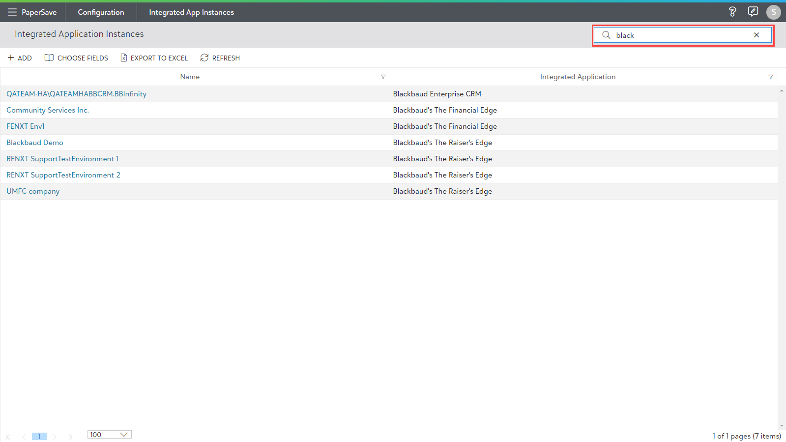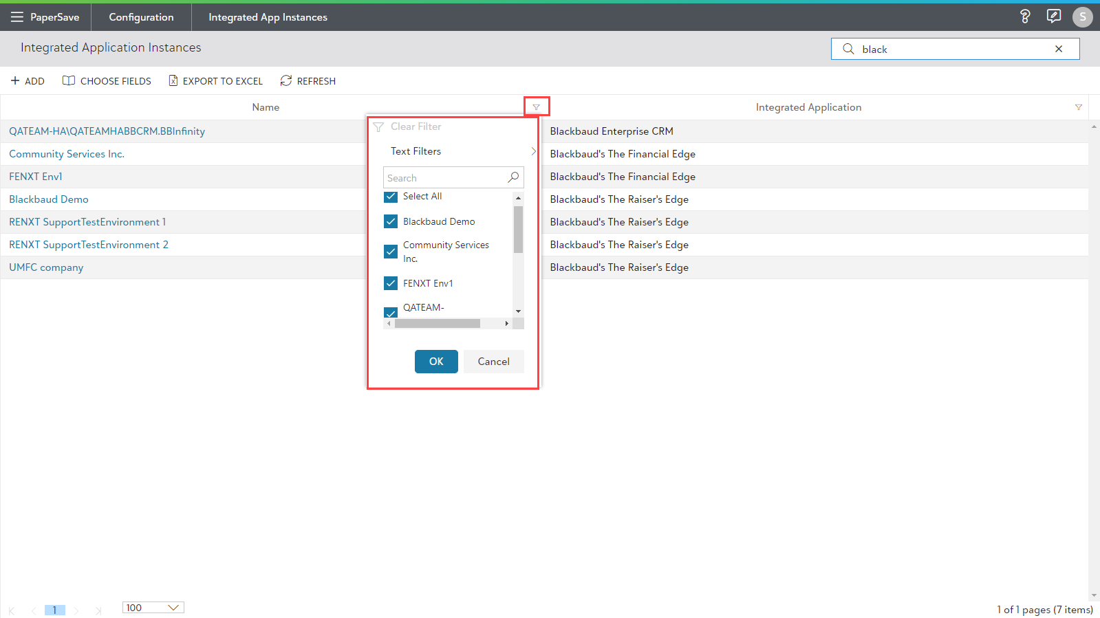 • Also, you can use a column filter to narrow the search within the list of integrated app instances, as shown in the below screen.