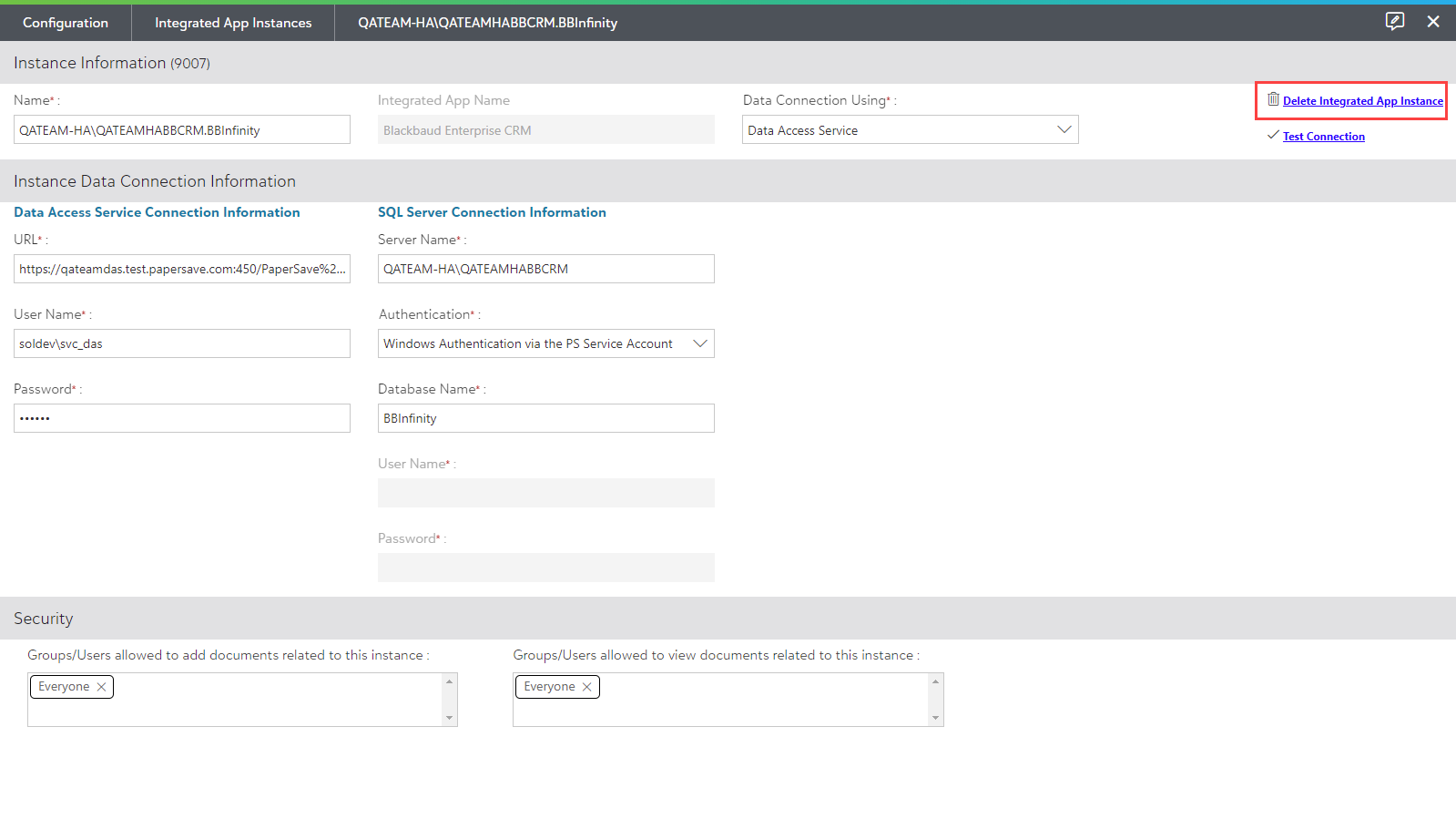 1) Click on Integrated App Instance in the Application Integration section of the Configuration Area.