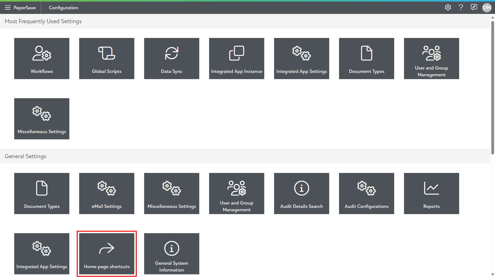 1) Click on the Home page shortcuts tile in the General Settings section of the Configuration Area.