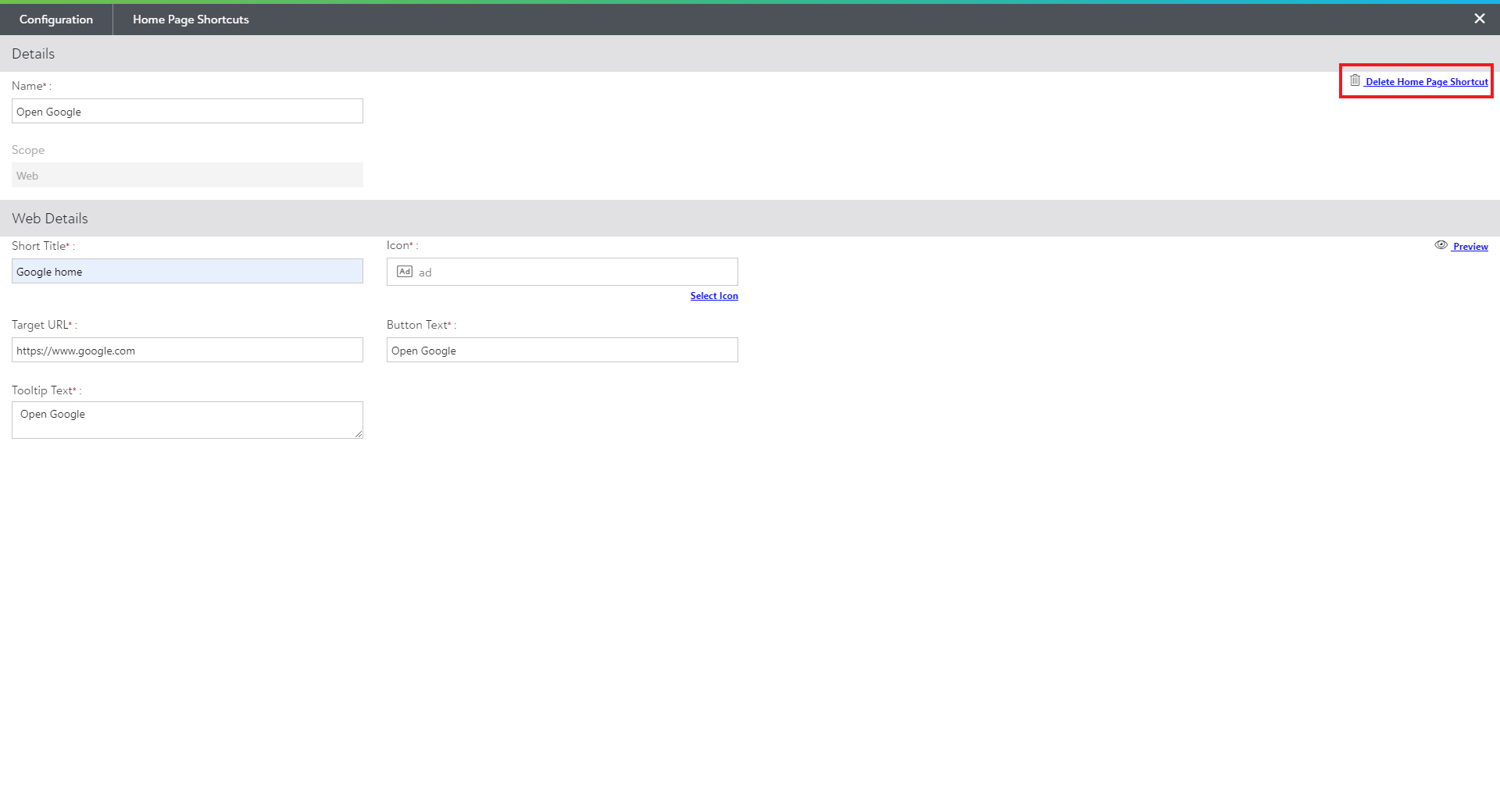 2) On the other hand, you can also open any existing shortcut and click on the Delete Home Page Shortcut option in the upper-right corner as shown in the below screen to delete a specific home page shortcut.