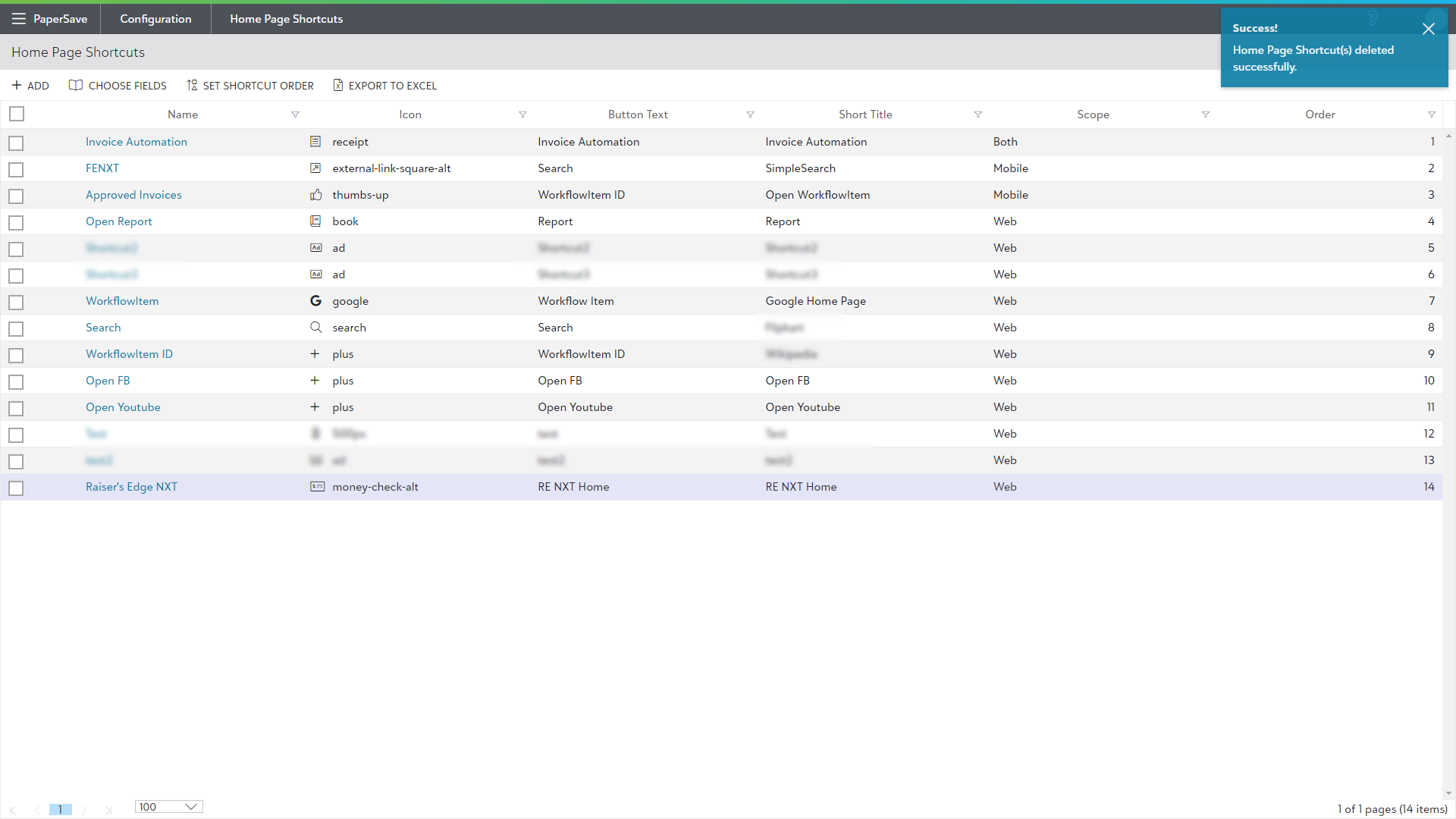 1) Select one or more Home Page Shortcuts from the list using the checkboxes or directly selecting the rows, and then click on the Delete option from the slide-up panel as shown in the below screen.