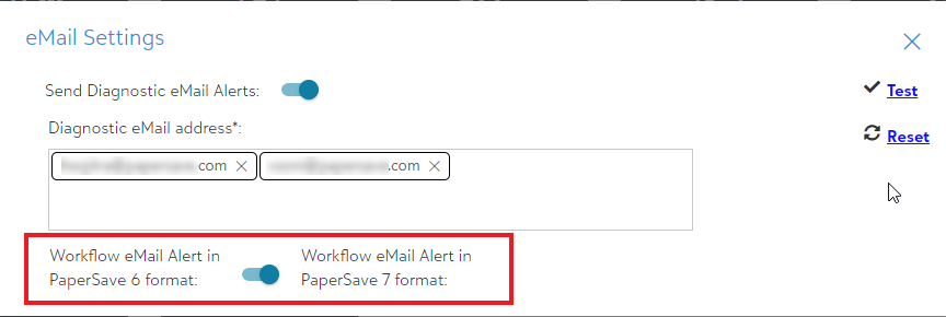 Tip: Email notification style (PaperSave 6 or 7 format) can be defined from within the eMail Settings in the Configuration Area as shown in the below screen. Use the toggle button to choose the desired format.