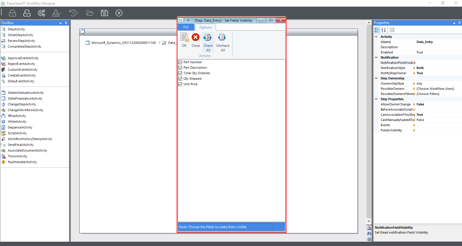 2) Field Details: This section includes the Workflow fields selected from the NotificationFieldVisibility field in the Notification section from the properties of Workflow designer as shown in the below screen:
